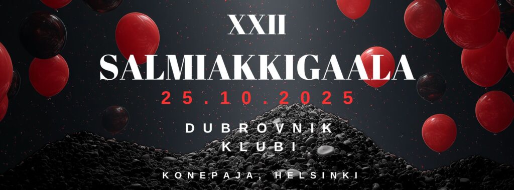 Salmiakkigaala on lauantai-iltana 25. lokakuuta klo 19-02 ravintola Dubrovnikissa Helsingin Konepajalla, Traverssikuja 3. Lue gaalasta lisää täältä. Palkintoehdokkaat ovat täällä. Liput voi hankkia ennakkoon tästä.